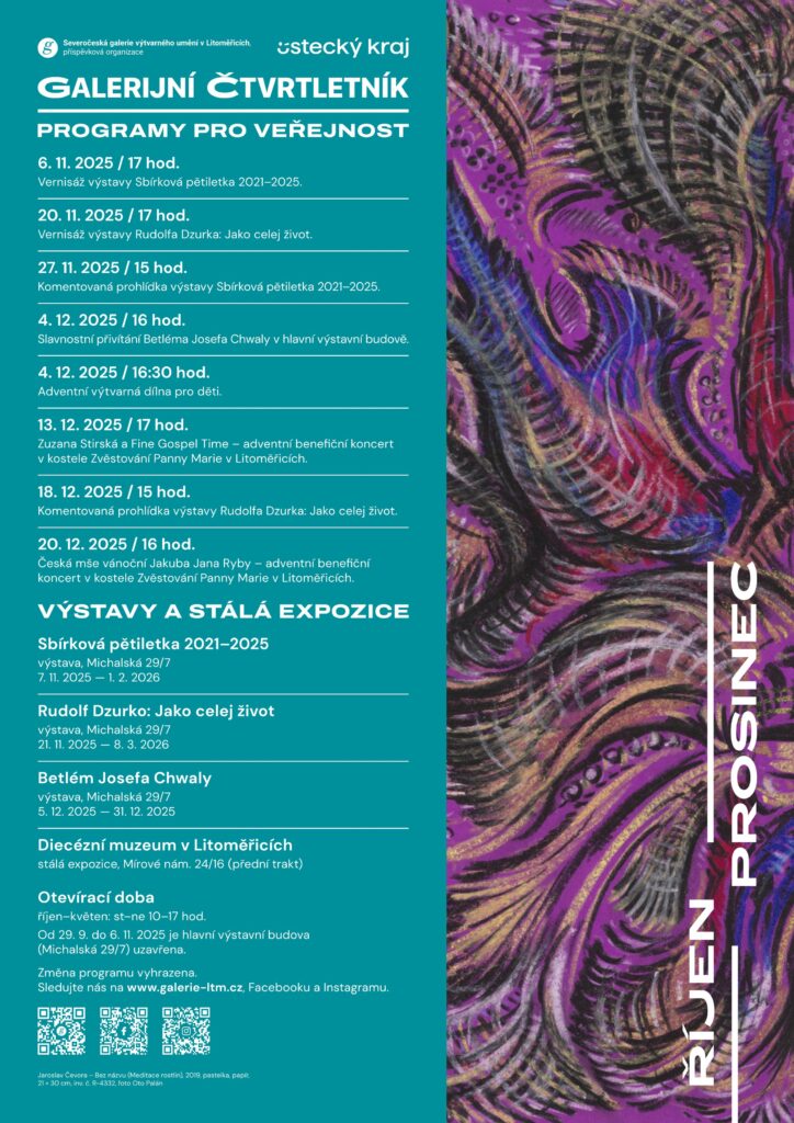 Severočeská galerie výtvarného umění v Litoměřicích zveřejňuje program na čtvrté čtvrtletí roku 2025. V následujících měsících pro Vás připravujeme tři nové výstavy v hlavní výstavní budově galerie (Michalská 29/7), adventní dílnu pro děti, komentované prohlídky a také tradiční benefiční koncerty v kostele Zvěstování Panny Marie.